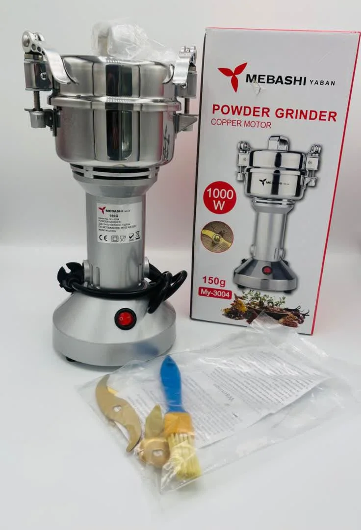 آسیاب نیمه صنعتی مباشی مدل MEBASHI 3004 با موتور ۱۰۰۰ وات، بدنه استیل و ظرفیت ۱۵۰ گرم، گزینهای عالی برای آسیاب انواع ادویه، قهوه و خشکبار است.