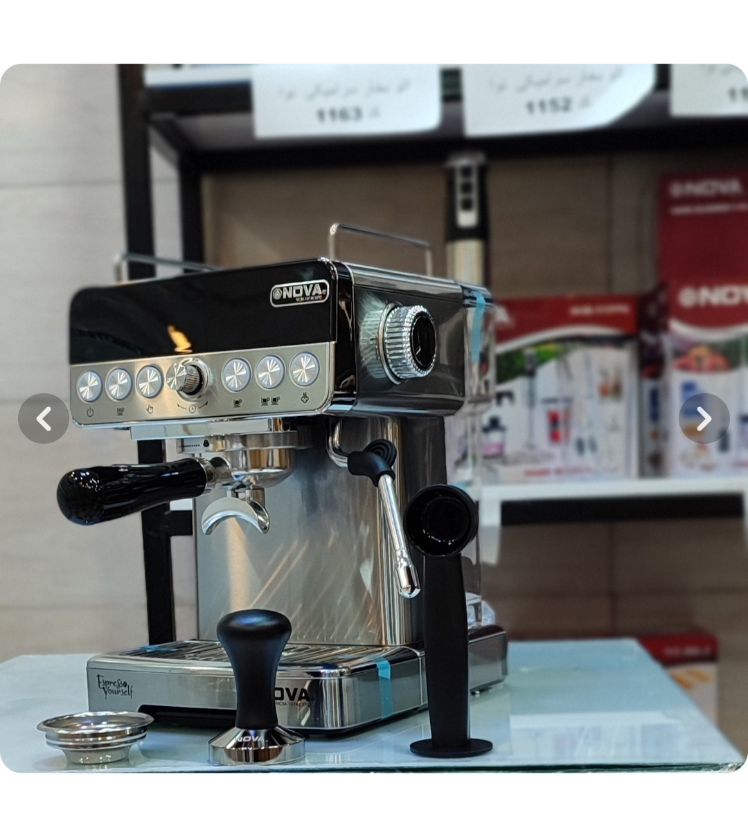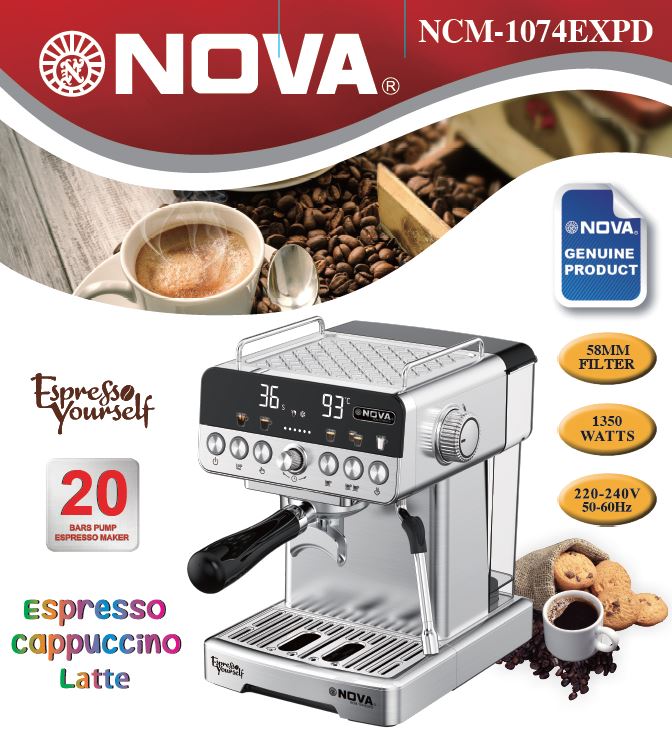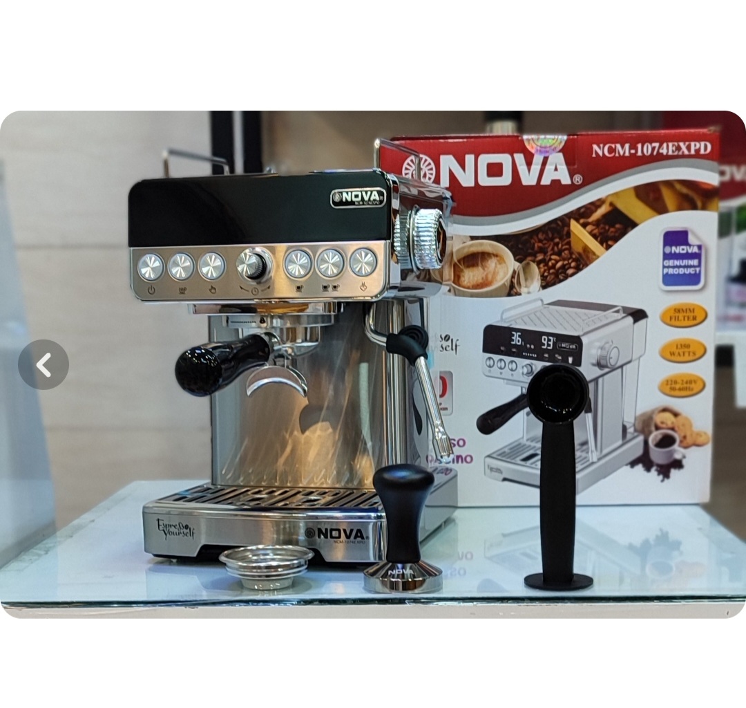 اسپرسو ساز نوا 1074نیمه صنعتی ( به شرط اصلی ) با پرتافیلتر 58 پمپ 20 بار اولکا 1350 وات صفحه نمایش تمام دیجیتال دکمه تک و دوبل خودکار دکمه دلخواه عصاره گیری زمان و دمای قابل تنظیم سیستم گرمایش ترمو بلاک دارای تمپر 58دارای بسکت تک و دوبل استیل 58بدنه تمام استیل ضد زنگ با آلیاژ بالا قابلیت نوشیدنی سرد مثل: کولدبورو مخزن آب 1/8 لیتری مناسب برای، خانه ، سوپرمارکت ، باشگاه ، کافی شاپ های کوچک