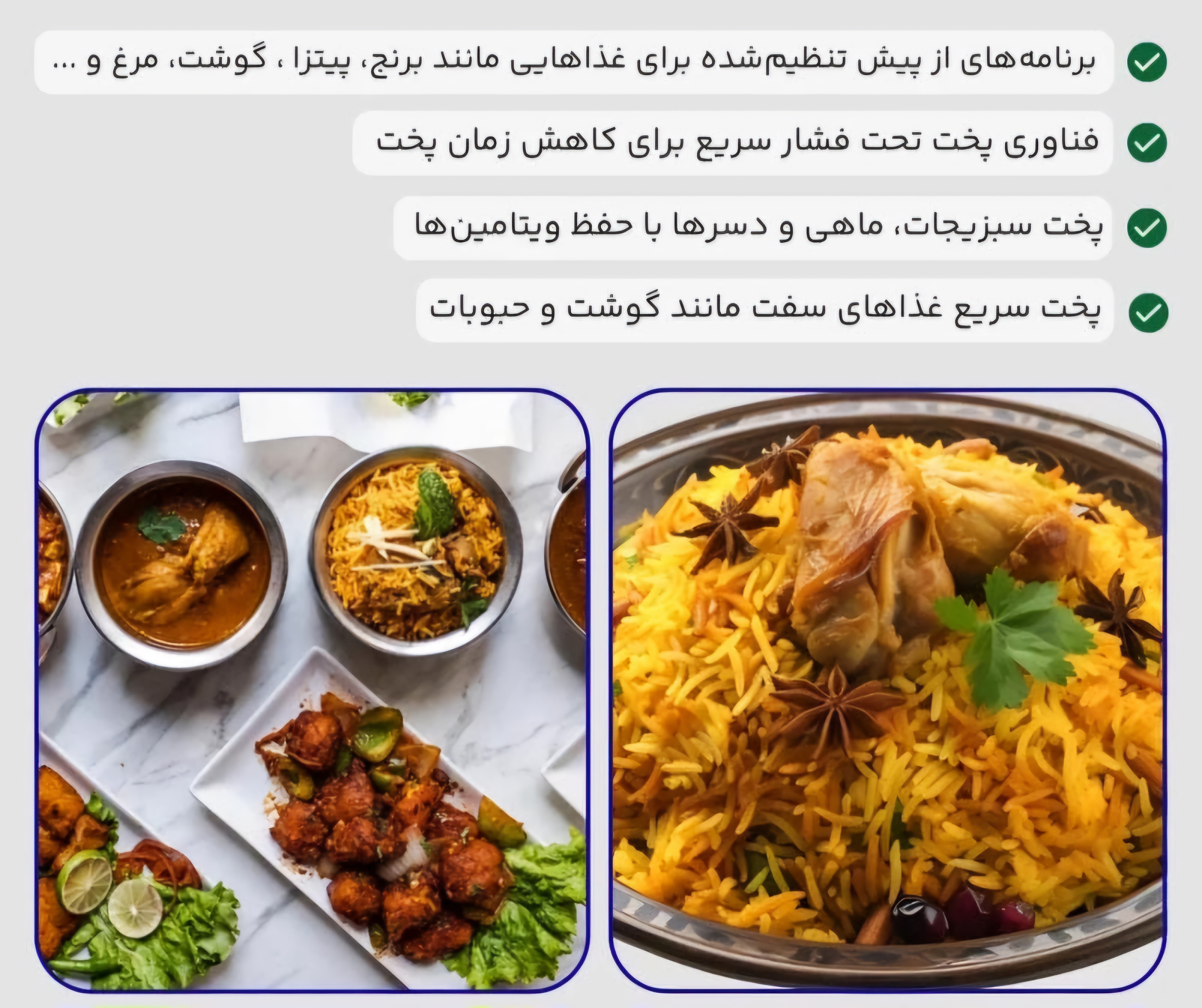 شامل :پخت گوشت – مرغ – ماهی – ماست بندی – پیتزا – پاستا – برنج – سرخکن – بخارپز – ماهیچه -سوپ و…